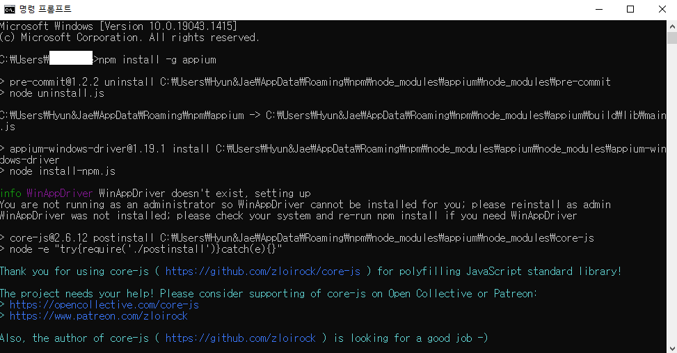 2) npm install -g appium 명령어를 입력하고 엔터를 칩니다.