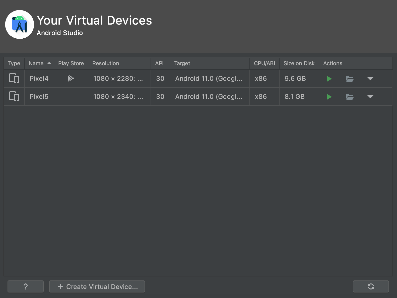 AVD 이름들이 나옵니다. 저는 Pixel4라는 이름의 Emulator를 실행 시키겠습니다.