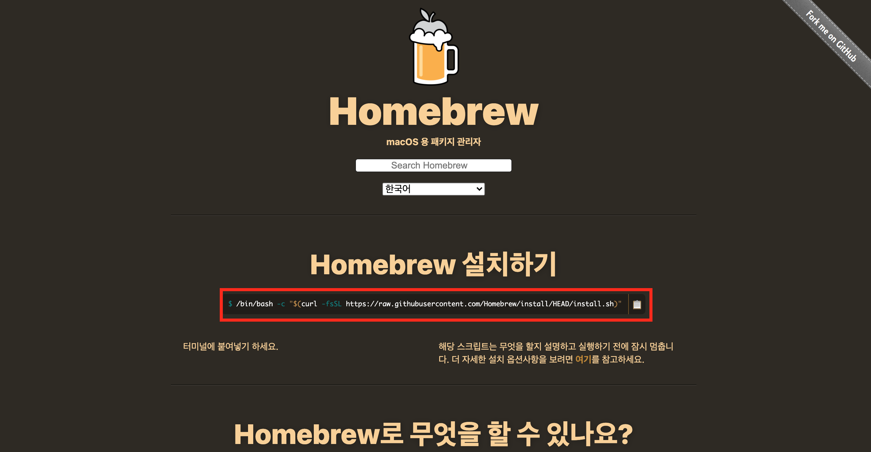 homebrew는 MacOS 전용 패키지 관리자이며, 쉽게 말해 프로그램을 설치할 때 터미널을 통해서 다운로드 받고 설치할 수 있도록 해 주는 도구입니다.