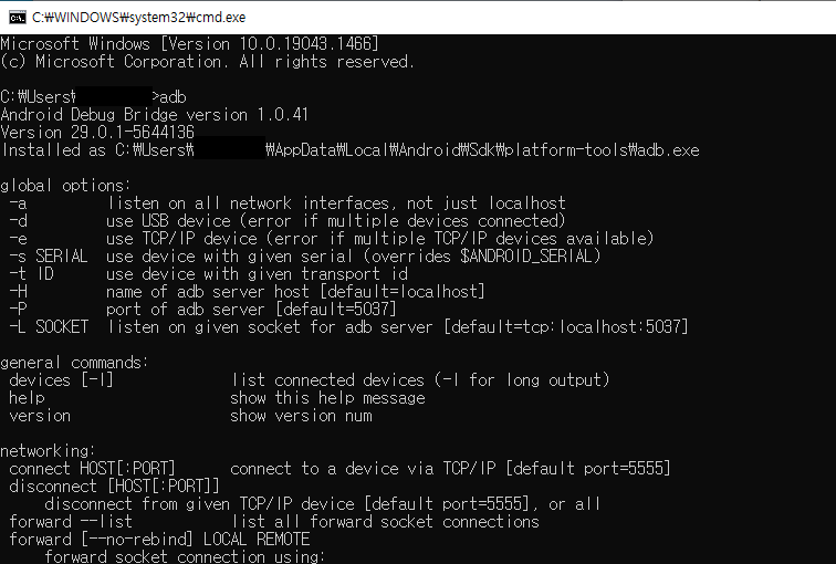 cmd창을 열고, adb를 입력 후 엔터를 치면 하기와 같이 나옵니다.