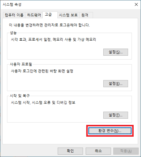 [환경 변수] 버튼을 클릭합니다.