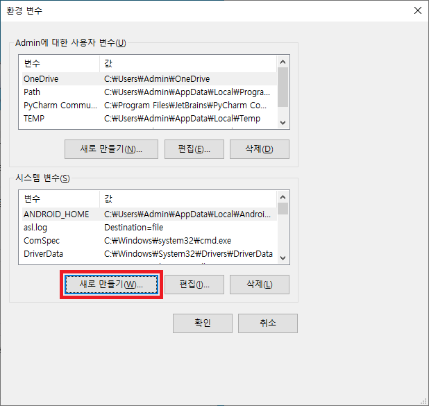 시스템 변수(S) 를 하기와 같이 입력 후 [확인] 버튼을 클릭합니다.