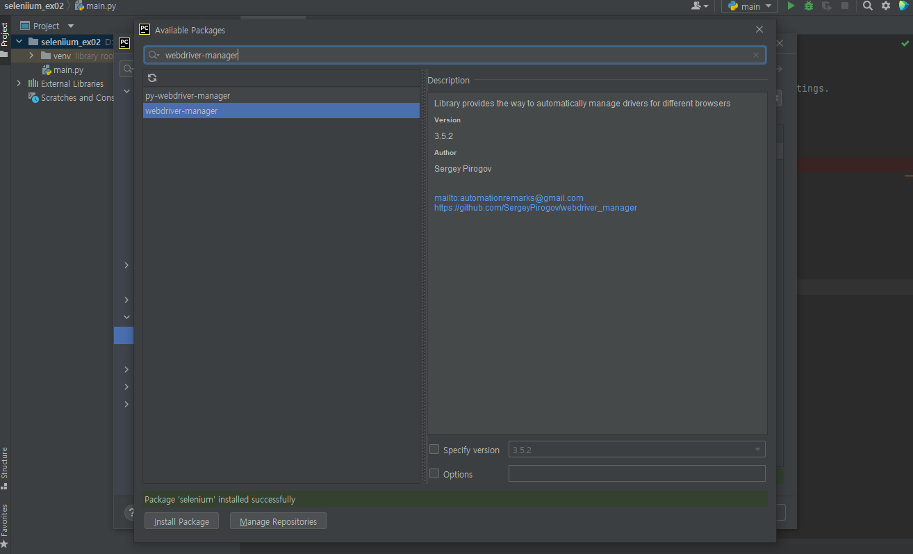 두번째 : File -> Settings -> Project: XXXX 로 적혀있는 부분 클릭 -> Python Interpreter 클릭 -> 여기서 [+] 버튼 클릭 -> 검색창에 webdriver-manager를 입력 후 [Install Package] 버튼을 클릭하면 됩니다.