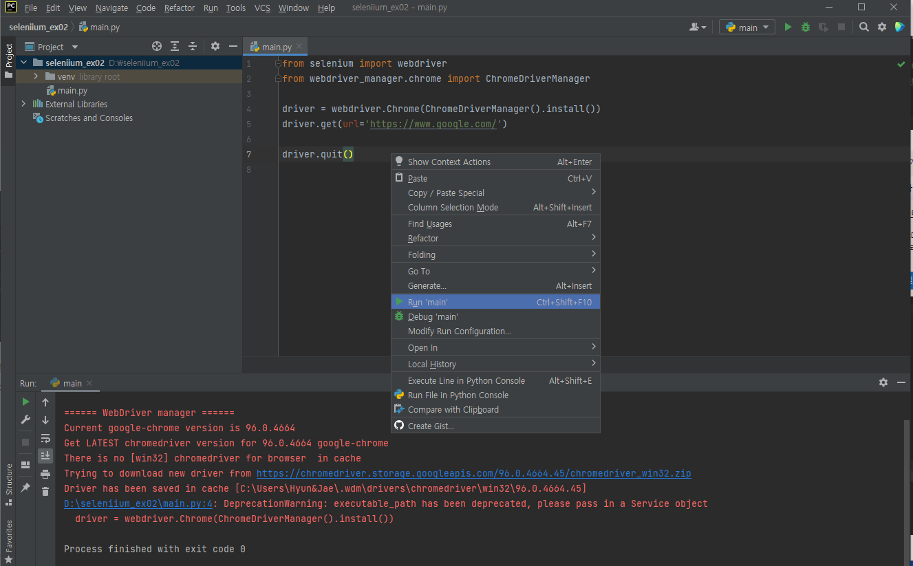 실행을 해보도록 하겠습니다. 실행은 마우스 오른쪽 버튼을 클릭하고, Run 'main' 하시거나 단축키 Control + Shift + F10 을 누르면 크롬 브라우저로 구글 웹페이지가 열렸다가 닫히는 것을 보실 수 있습니다.